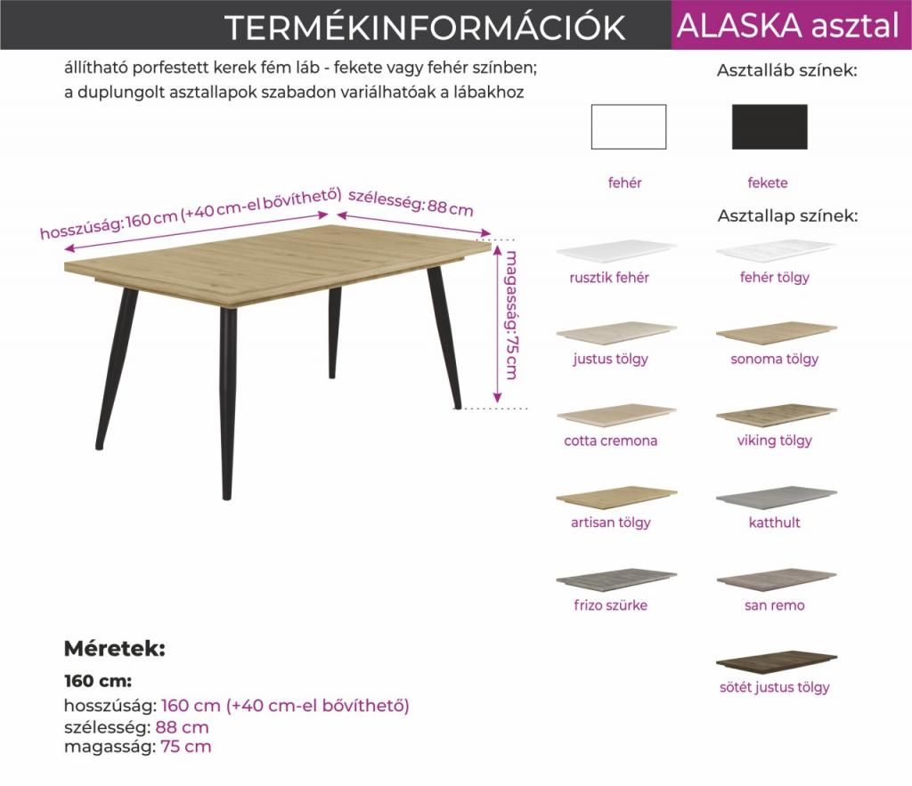 Alaska asztal 160 x 88 cm-es asztallap méret, dizájnos feketére vagy fehérre festett kerek fémlábakkal.
