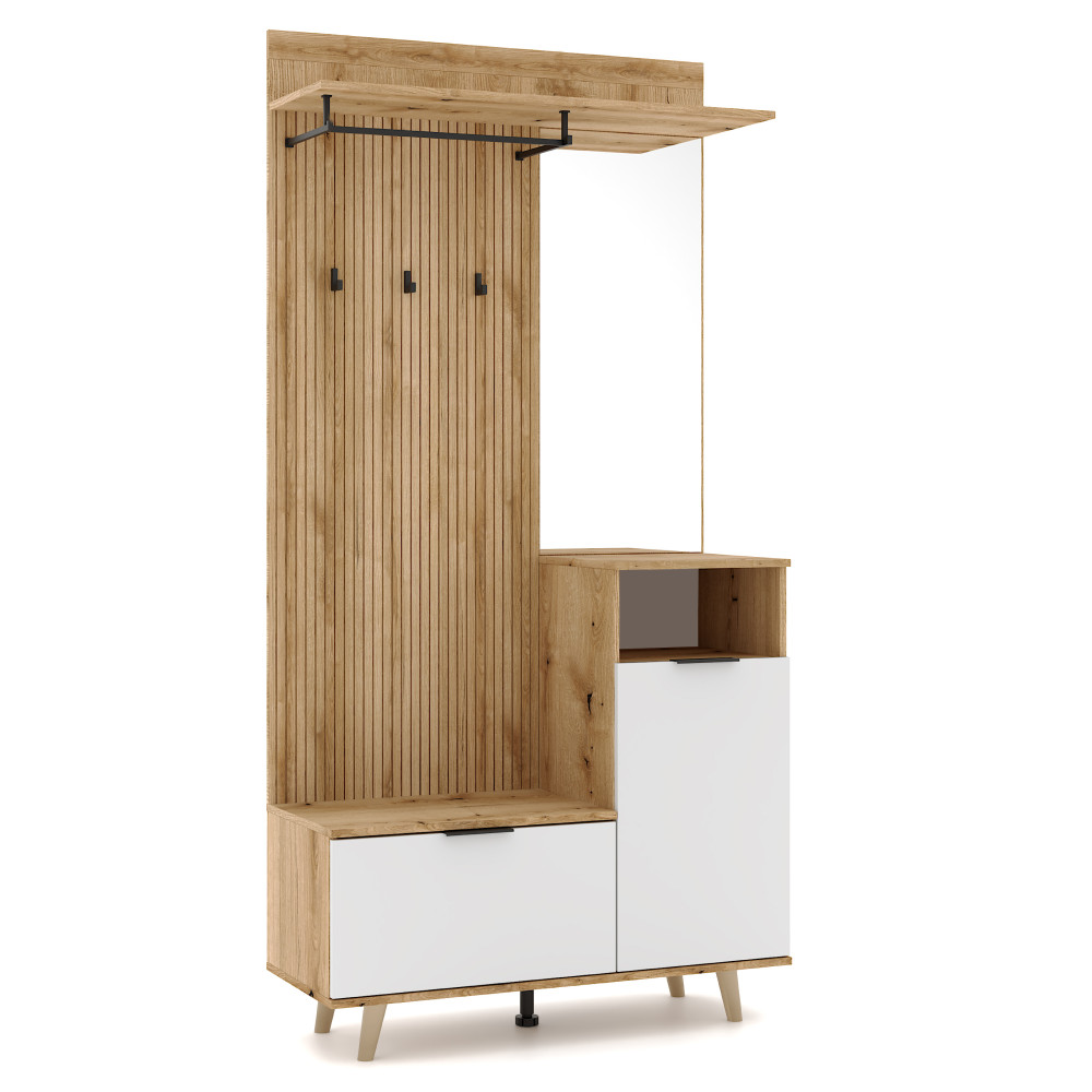 Anyag: DTD/ABS élek Szín: evoke tölgy/fehér Méretek (SzxMéxMa): 100x40x204 cm Anyag vastagsága: 1,6 cm Nyitott tárhely Szekrény polcokkal Szekrény méretei (SzxMa): 35x83,6 cm Polcok teherbírása: 5 kg Billentős cipőtartó Cipőtartó méretei (SzxMa): 65x34 cm Cipőtartó felső lapjának teherbírása: 10 kg Akasztós rész Akasztórúd teherbírása: 1 kg 3 kampó Kampó teherbírása: 1 kg Tükörrel Tükör méretei (SzxMa): 35x87,9 cm Dekoratív lamella 3D panel Fogantyúkkal Lábakon Lábak anyaga: fa Központi támasztó láb Támasztó láb anyaga: műanyag Az alsó tér magassága a padlótól: 12 cm Ajánljuk a falhoz rögzíteni Szétszerelve szállítva