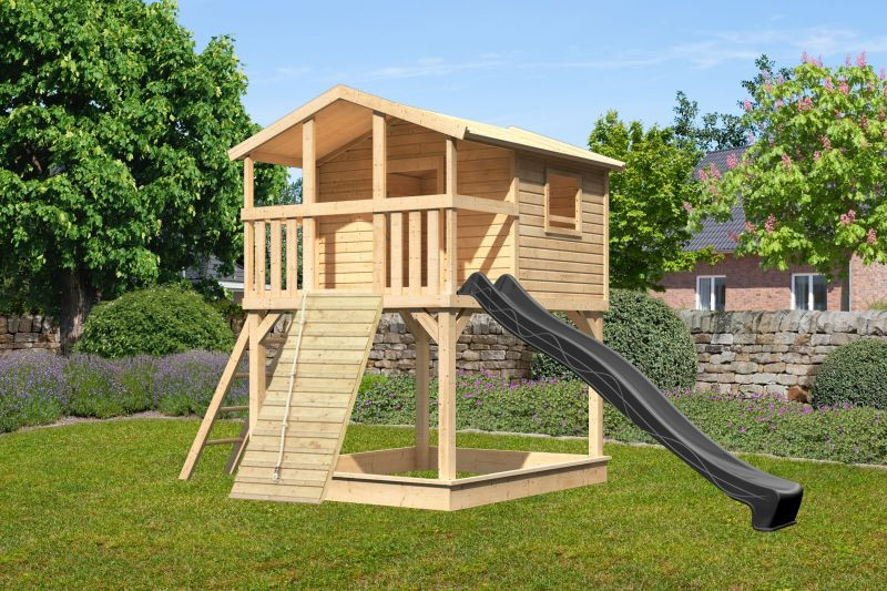 Karibu Benjamin 1. cölöpös fa játszóház, kültéri kerti játszóház létrával, antracit csúszdával, fa rámpával (RP)
