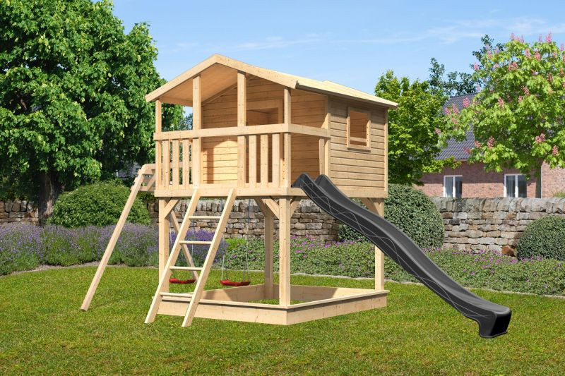 Karibu Benjamin 2. cölöpös fa játszóház, kültéri kerti játszóház létrával, dupla hintával, antracit csúszdával (RP)
