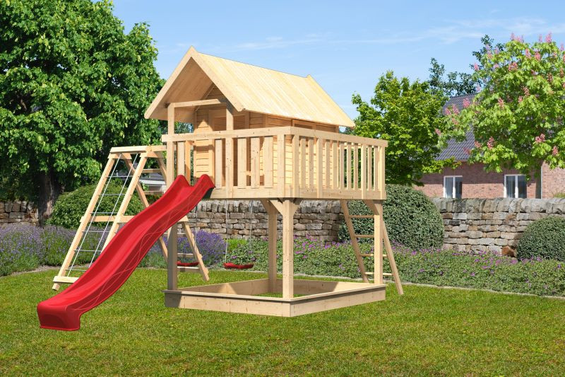 Karibu Fidel 2. cölöpös fa játszóház létrával, kültéri kerti játszóház, piros csúszdával, dupla hintával, mászókával (RP)