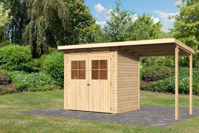 Karibu Glücksburg 2. kis fa kerti tároló, fészer, modern tetővel és bővítménnyel/terasszal, modern dizájnnal, natúr fából 387 cm x 156 cm (RP)