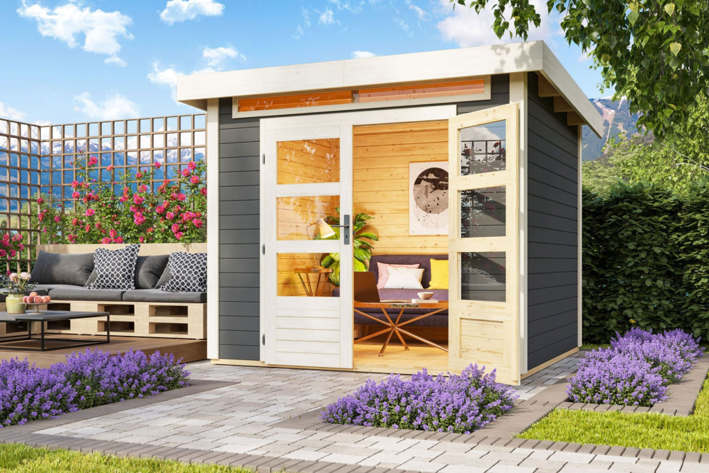 A Karibu Kandern 3 kerti ház ideális választás mindazok számára, akik praktikus, ugyanakkor esztétikus megoldást keresnek kerti eszközeik, bútoruk vagy egyéb felszereléseik tárolására. A modern megjelenésű, vonzó tetőkialakítással rendelkező fészer két elegáns színben – terra szürke és natúr kivitelben – érhető el, így könnyedén illeszkedik bármilyen kert stílusához.