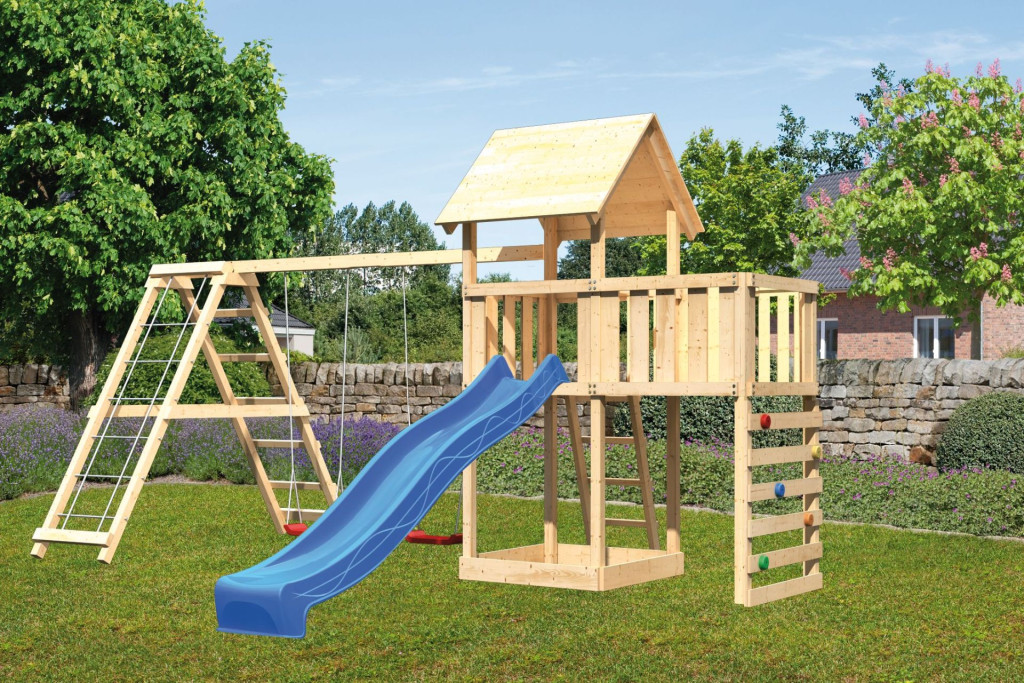 Játszótorony kék csúszdával, dupla hintával, mászófallal, létrával, torony toldással.