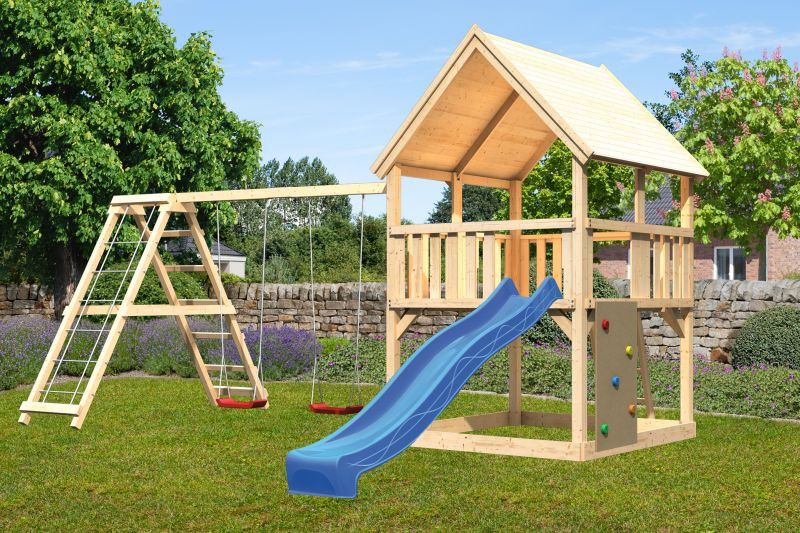 Karibu Luis 2. Játszótorony kék csúszdával, dupla hintával, mászókával, mászófallal, létrával (RP)