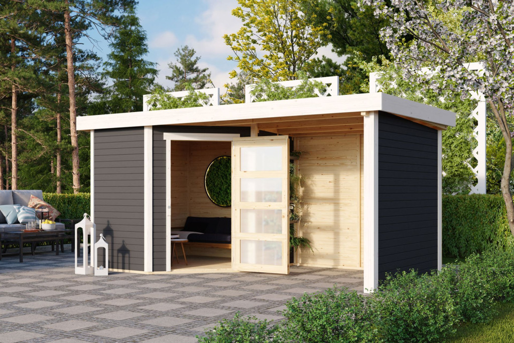 Karibu Schwandorf 3. Terra szürke fa 5 oldalas kerti tároló, fészer tetővel, oldal- és hátfallal rendelkező bővítménnyel/terasszal, modern dizájnnal, 433 cm x 217 cm (RP)