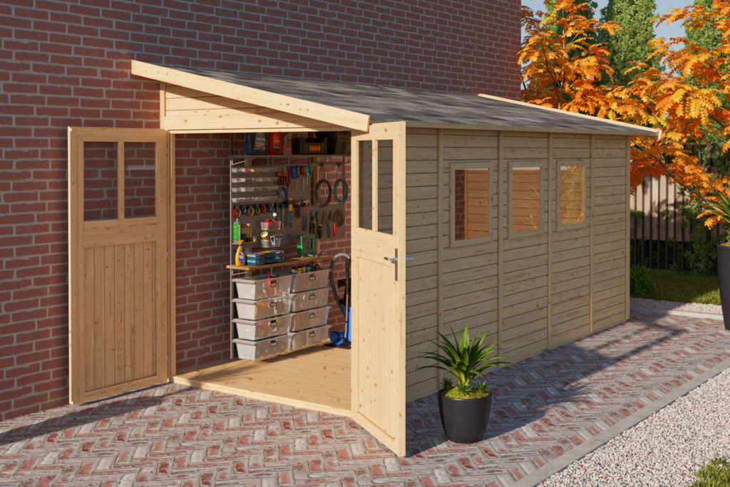Karibu Wandlitz 5. fa kerti tároló, fészer, modern tetővel, natúr fából 181 cm x 442 cm (RP)