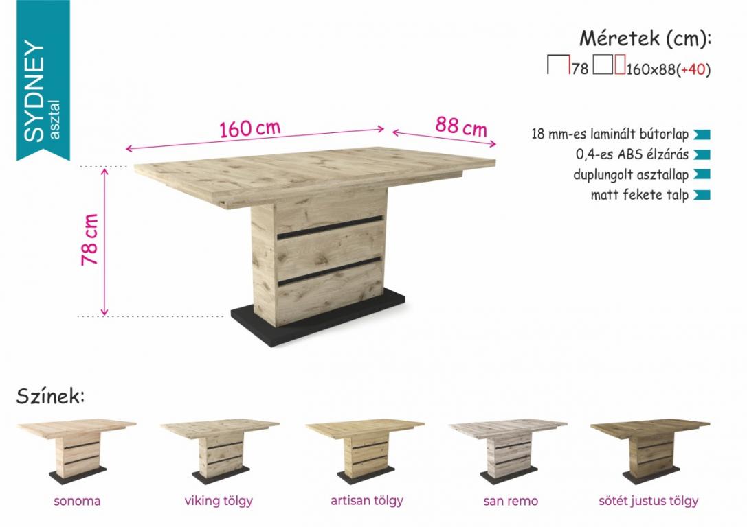 A Sydney asztal méretei: 160 x 88 cm ( + 40 cm vendéglappal 200 x 88 cm-ig bővíthető )