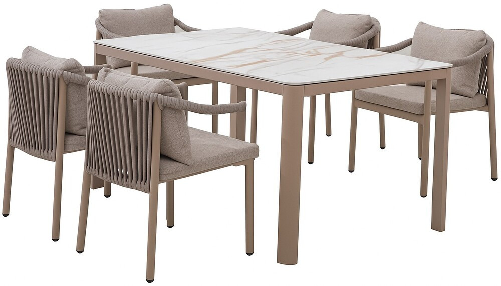 Anyag: alumínium szerkezet, zsinórfonatos kivitel, szinterezett kő asztallap, 5 cm vastag poliészter párnák
