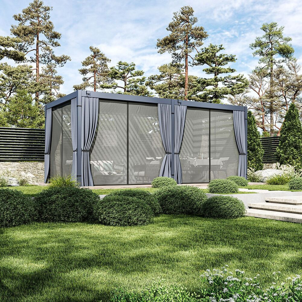 A körbefutó, finom szövésű szúnyoghálók hatékonyan kizárják a szúnyogokat és egyéb rovarokat, miközben megmarad a természetes légáramlás, ami különösen fontos a nagy lefedett felületeknél. A hozzá tartozó függönyök tovább növelik a komfortot és a magánélet védelmét, árnyékot adnak, csökkentik a szélhatást, és vizuálisan is leválasztják a pergola alatti teret a környezetről.