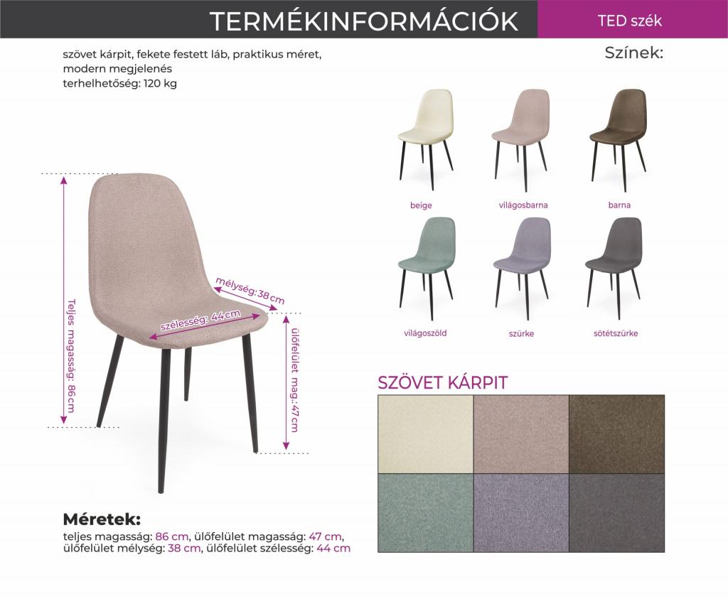 A Ted szék szövet kárpittal, fekete porfestett lábbal, modern kialakítással készül.